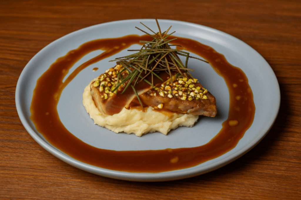 Atún sellado, con salsa teriyaki y costra de pistache, sobre puré de papa cremoso.